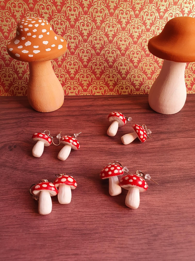 Boucles d'oreilles Champignons de la collection Automne 2024, donc petite réduction (25->20€). Acier inoxydable, pâte polymère et peinture acrylique puis vernis. Peuvent être un peu lourdes si vous avez l'habitude des boucles d'oreilles très légères.