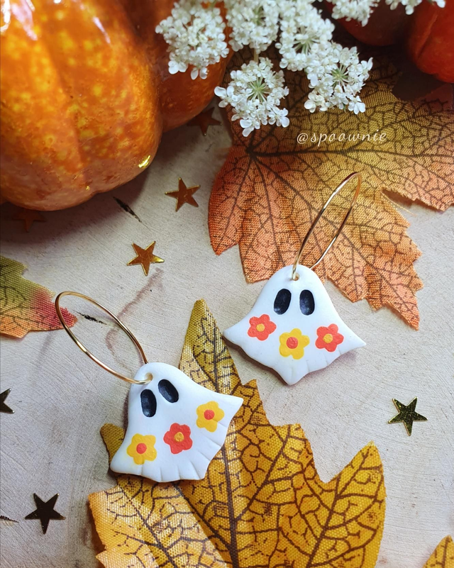 Boucles d'oreilles Fantômes Fleuris faites mains et pâte polymère et peinture acrylique. Creoles en acier inoxydable doré. Si vous souhaitez les remplacer par des creoles argentées, vous pouvez le préciser dans la case "message à l'attention du commerçant" au moment du paiement. 👻🌼