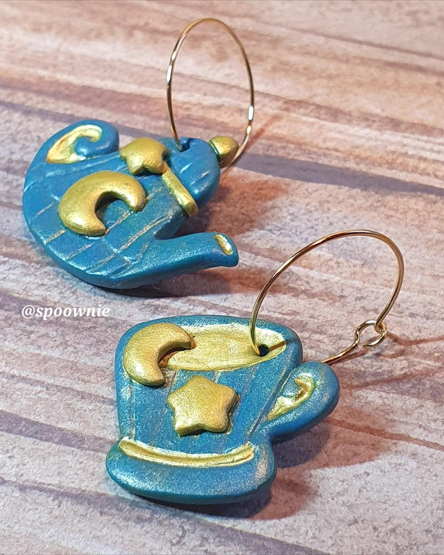 Boucles d'oreilles Service à Thé céleste faites mains en pâte polymère et peinture acrylique puis vernis. Creoles en acier inoxydable doré. Si vous souhaitez les remplacer par des creoles argentées, vous pouvez le préciser dans la case "message à l'attention du commerçant" au moment du paiement. ✨️