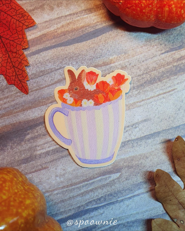 🍁 Stickers Lapin dans sa tasse avec ses tulipes, ambiance cottagecore, qualité premium, effet mat, à partir d'une illustration réalisée par mes soins à la gouache